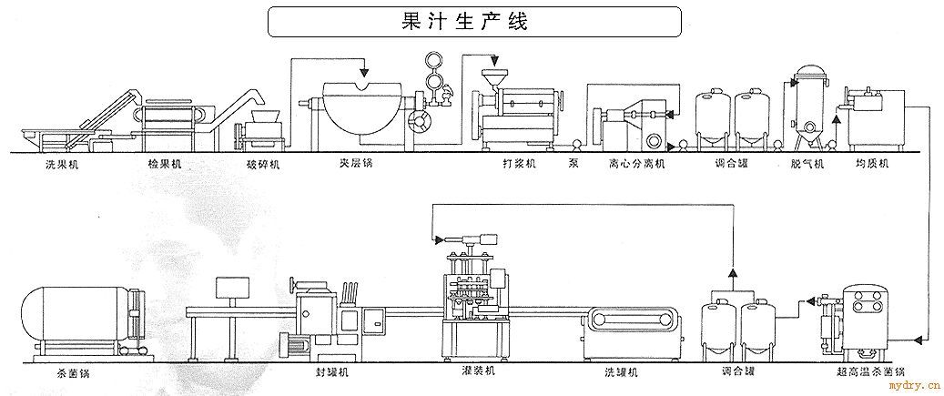 生產(chǎn)流程: 清洗(清洗機(jī))— 檢果(檢果機(jī)) — 破碎(破碎機(jī)) — 打漿(打漿機(jī)) — 榨汁(榨汁機(jī)) — 過(guò)濾(過(guò)濾器)—濃縮(濃縮器)—調(diào)配(調(diào)配罐) — 殺菌(滅菌機(jī))—無(wú)菌儲(chǔ)存(無(wú)菌貯罐)— 無(wú)菌灌裝 — 成品包裝