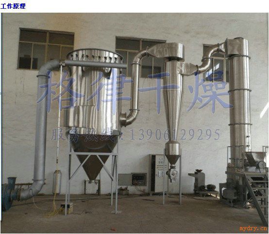 XSG系列旋轉閃蒸干燥機是我常州格律干燥消化吸收,大膽采用國外先進技術、并結合國內干燥的實際情況,自行開發設計的實用新型*產品。熱空氣由入口管以適宜的噴動速度從干燥機底部進入攪拌粉碎干燥室,對物料產生強烈的剪切、吹浮、旋轉作用,于是物料受到離心、剪切、碰撞摩擦而被微粒化,強化了傳質傳熱。 物料由螺旋加料器進入干燥器內,在高速旋轉攪拌器的強烈作用下,物料受到撞擊,摩擦及剪切的作用下得到分散,塊狀物料迅速粉碎,與熱空氣充分接觸觸、受熱、干燥。脫水后的干粉料隨熱氣上升,分級環將大顆粒截留,小顆粒從環中心排出干燥器外,由旋風分離器回收,未干透或大塊物料受離心力作用甩向壁器,重新落到底部被粉碎干燥。 由于氣固兩相作旋轉流動,固相慣性大于氣相,固氣兩相間的相對速度較大,強化兩相間的傳熱性質,所以該機生產強度高。 閃蒸干燥機設備優點: 干燥室內周向氣速高,物料停留時間短,有效防止物料粘壁及熱敏性物料變質,并可一次干燥成均勻的粉狀產品,省去了粉碎、篩分等工序。 干燥室裝有分級環及旋流片,物料細度和終水份可調。特殊的分風裝置,降低了設備阻力,并有效提高物料的干燥均勻度。 干燥機底部設置特殊的冷卻裝置及氣壓密封裝,避免了物料在底部高溫區產生變質現象。 能有效控制終水份和細度,通過對加料、熱風溫度、分級器的調節,保證產品的濕含量及細度均勻一致。 閃蒸干燥機適用范圍: 有機物:阿特拉津(農藥殺蟲劑)、月桂酸隔、苯甲酸、安息香酸、殺菌丹、草酸鈉、醋酸纖維素、有機顏料等。 染 料:蒽醌、黑色氧化鐵、靛藍顏料、丁酸、氫氧化鈦、硫化鋅、各種偶氮染料中間體。 無機物:硼砂、碳酸鈣、氫氧化物、硫酸銅、氧化鐵、碳酸鋇、三氧化銻、各種金屬氫氧化物、各種重金屬鹽、合成冰晶石等。 食 品:大豆蛋白、膠凝淀粉、酒槽、小麥糖、小麥淀粉等。 閃蒸干燥機特點: 由于物料受到離心、剪切、碰撞、摩擦而被微粒化呈高度分散狀態及固氣兩相間的速度較大,強化了傳質傳熱,使該機生產強度高。 干燥氣體進入干燥機底部,產生強烈的旋轉氣流,對器壁上物料產生強烈的沖刷帶出作用,消除粘壁現象。 在干燥機低部高溫區,熱敏性物料不與熱表面直接接觸,并裝有特殊裝置,解決了熱敏性物料的焦化變色問題。 由于干燥室內氣速高,物料停留時間短,達到高效、快速、小設備、大產量。 干燥室上部加裝陶析環及旋流片可以控制出口物料的粒度及溫度,以達到不同物料的終水份粒度的要求。 閃蒸干燥機技術參數