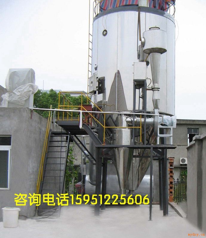 工作原理 空氣經過濾和加熱,進入干燥器頂部空氣分配器,熱空氣呈螺旋狀均勻地進入干燥室。料液經塔體頂部的高速離心霧化器,(旋轉)噴霧成極細微的霧狀液珠,與熱空氣并流接觸在極短的時間內可干燥為成品。成品連續地由干燥塔底部和旋風分離器中輸出,廢氣由引風機排空。