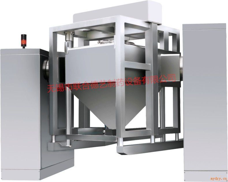 This equipment is composed of frame, rotating cage; drive, lifting, brake and control systems. When operating, firstly, load the bin in the rotating cage and press "confirm" key on the touch panel, the bin will be automatically raised in position and clamped. On recep-tion of clamped signal by the sensors, the drive system starts blending task according to the set time and rotation speed. On reaching all the set parameters, the brake system operates automatically to stop the rotating cage to a horizontal position and the blending task is finished. Then, the lifting system works to lower the bin on the ground and on reaching that position, it stops automati-cally. Finally, data of this batch are printed. Move out the bin from the rotating cage to transfer it for the next process.