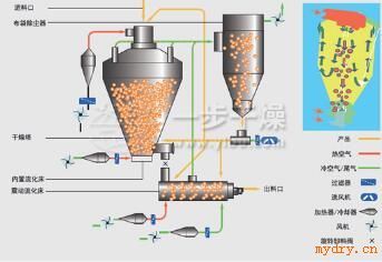PYG系列頂出風壓力噴霧干燥機 操作方式 液體的進料可以是溶劑、懸浮液或乳蝕液,進料通過高壓泵輸送到位于塔體頂部 XX 分配器內的霧化器(噴槍)中。 壓力噴槍容液體霧化進入高速的千燥空氣流,產生霧化液滴由氣流帶動向下朝內盈流化床運行,同時被千燥成顆粒。 在顆粒進去流化床的同時,氣流反向向上運行,從干燥塔頂部被排出。 從排出空氣中分離出來的超細顆粒重新循環回到干燥塔塔體內。 流化床內顆粒的流化,細粉循環和干燥氣流內顆粒移動發生在一個比傳統干燥系統的粉塵密度更高的空氣環境中。克服顆粒表面的粘結問題,含水里高的顆粒可以被加工處理。 進入流化床的顆粒水分含.可以被控制在一定要求程度內,從而獲得較大顆粒和結構改變(附聚或制粒) 在有需要的時候,產品的*終干燥和冷卻可以在與內,流化床出口相連接的另一個外置流化床內進行。 特點 1.成品顆粒大小,水分含里調節范圍大; 2.設備總高度比原來的并流塔低; 3.節約能源,由于頂出風的回風室在塔體上部的高負壓區蒸發,降低了蒸發溫度,既節約了熱源,也節約了能 4.產品品質好,顆粒均勻,顆粒度調整范圍廣,顆粒色澤、沖調性能較好。 原理 食品:咖啡,乳制品,蛋制品,調味品,麥芽糊精,湯料,植物蛋白,醉母等。 化工:清洗劑,染料,化肥,無機鹽,殺蟲劑等。 |