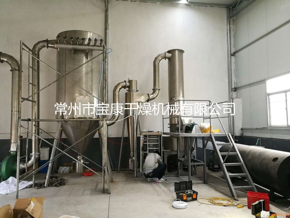 XSG旋轉閃蒸干燥機 概述: XSG系列旋轉閃蒸干燥機是在引進、吸收國外技術的基礎上,開發成功的新型干燥設備,該機技術先進,設計合理、結構緊湊,適用范圍廣,生產能力大,產品質量好,效率高,節能。在一個設備內干燥、粉碎、篩分一次性完成,消除環境污染,整機性能達到國際八十年代先進技術。 工作原理: 熱空氣由入口管以適宜的噴動速度從干燥機底部進入粉碎攪拌干燥室,對物料產生強烈的剪切、吹浮、旋轉作用,,于是物料受到離心、剪切、碰撞、摩擦而被微粒化,強化了傳質傳熱。在干燥機底部,較大較濕的顆粒被旋轉氣流夾帶上升,在上升過程中進一步干燥。由于氣固兩相作旋轉流動,固相慣性大于氣相,固氣兩相的相對速度較大,強化兩相間的傳質傳熱,所以該機生產強度高。 應用范圍: 1、有機物:阿特拉津(農藥殺蟲劑)、月桂酸隔、安息香酸、殺菌丹、草酸鈉、醋酸纖維素等。 2、染 料:蒽醌、黑色氧化鐵、靛藍顏料、丁酸、氫氧化鈦、硫化鋅、各種偶氮染料中間體。 3、無機物:硼砂、碳酸鈣、氫氧化物、硫酸銅、氧化鐵、碳酸鋇、三氧化銻、各種金屬氫氧化物、各種重金屬鹽、合成冰晶石等。 4、食 品:大豆蛋白、膠凝淀粉、酒槽、小麥糖、小麥淀粉等。 產品特點: 1、多種加料裝置供選擇,加料連續穩定,過程中間不會產生架橋現象。 2、干燥機底部設置特殊的冷卻裝置,避免了物料在底部高溫區產生變質現象。 3、特殊的氣壓密封裝置和軸承冷卻裝置,有效延長傳動部分的使用壽命。 4、特殊的分風裝置,降低了設備阻力,并有效提供了干燥器的處理風量。 5、干燥室裝有分級環及旋流片,物料細度和終水分可調。(如碳酸鈣終水份可調至≤0.1%) 6、相對其它干燥方法而言,可有效增加物料比重。 7、干燥室內周向氣速高,物料停留時間短,有效防止物料粘壁及熱敏性物料變質現象,達到高效、快速、小設備、大生產。 技術參數: