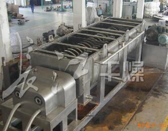 空心槳葉(污泥)干燥機工作原理: 空心軸上密集排列著楔型中空漿葉,熱介質經空心軸流經漿葉。單位有效容積內傳熱面積很大,熱介質溫度從-40℃到320℃,可以是水蒸汽,也可以是液體型:如熱水、導熱油等。間接傳導加熱,沒有攜帶空氣帶走熱量,熱量均用來加熱物料。熱量損失僅為通過器體保溫層向環境的散熱。楔型漿葉傳熱面具有自清潔功能。物料顆粒與楔型面的相對運動產生洗刷作用,能夠洗刷掉楔型面上附著物料,使運轉中一直保持著清潔的傳熱面。漿葉干燥機的殼體為Ω型,殼體內一般安排二到四根空心攪拌軸。殼體有密封端蓋與上蓋,防止物料粉塵外泄而充分發揮作用。傳熱介質通過旋轉接頭,流經殼體夾套及空心攪拌軸,空心攪拌軸依據熱介質的類型而具有不同的內部結構,以保證理想的傳熱效果
