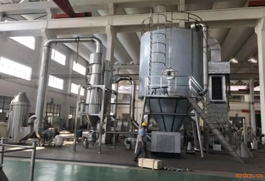 空氣經(jīng)過過濾和加熱,進(jìn)入干燥器頂部空氣分配器,熱空氣呈螺旋狀均勻地進(jìn)入干燥室。料液經(jīng)塔體頂部的高速離心霧化器,(旋轉(zhuǎn))噴霧成極細(xì)微的霧狀液珠,與熱空氣并流接觸,在極短的時(shí)間內(nèi)可干燥為成品。成品連續(xù)地由干燥塔底部和旋風(fēng)分離器中輸出,廢氣由風(fēng)機(jī)排空。