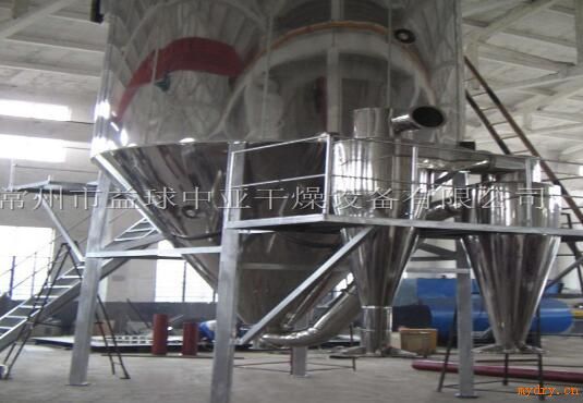 空氣經(jīng)過過濾和加熱,進(jìn)入干燥器頂部空氣分配器,熱空氣呈螺旋狀均勻地進(jìn)入干燥室。料液經(jīng)塔體頂部的高速離心霧化器,(旋轉(zhuǎn))噴霧成極細(xì)微的霧狀液珠,與熱空氣并流接觸,在極短的時(shí)間內(nèi)可干燥為成品。成品連續(xù)地由干燥塔底部和旋風(fēng)分離器中輸出,廢氣由風(fēng)機(jī)排空。